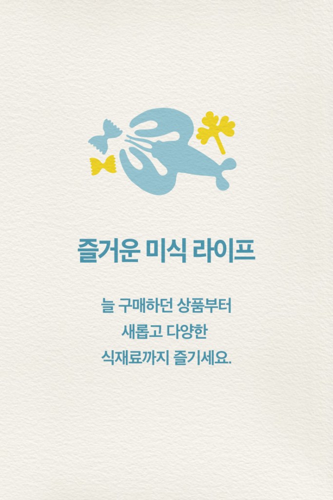 새벽배송의 브랜드 컬러인 하늘색과 노란색을 중심으로, 앱 기반 서비스의 특성을 직관적으로 전달할 수 있도록 주요 기능과 혜택을 아이콘 형태로 시각화했습니다. 또한, 매월 제공되는 쿠폰은 해당 월의 제철 식재료에서 모티브를 얻은 일러스트를 그림자 실루엣 형태로 구성하여, 추상적이면서도 직관적인 메시지를 담은 그래픽 요소로 완성도를 높였습니다.